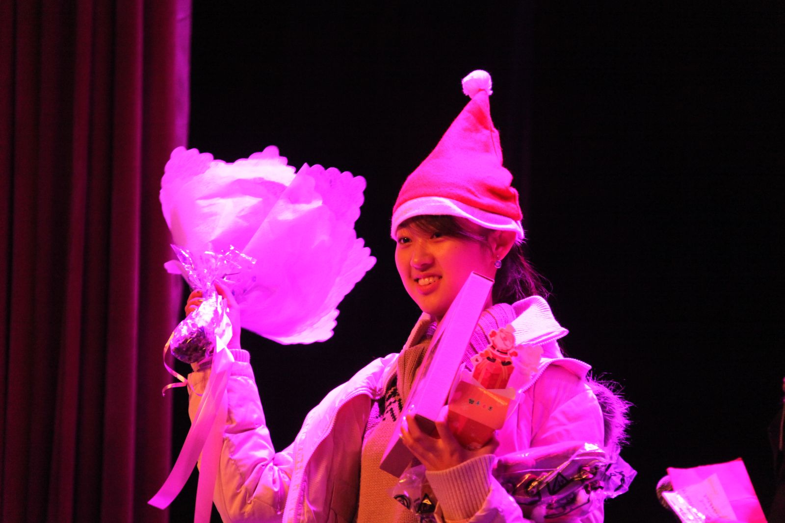 无巧不成书,晚会当天正巧是一位同学的生日。圣诞老人代表国院全体师生送给她一份意义深厚的生日礼物,感谢她为晚会付出的努力,祝愿她在以后的生活上、学业中越来越好、越来越强。