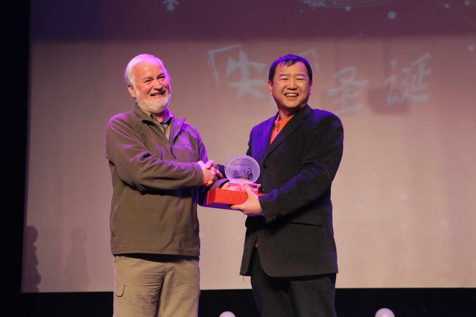 箫声鼎沸、鼓乐齐鸣、热闹非凡的晚会,也不乏催人泪下的感人一幕。恰逢外教Douglas执教最后一年,而他的执教生涯又恰在北农走完最后一程。公司党总支书记谭峰代表历届北农学子向他送上印有“SPECIAL THANKS TO DOUGLAS H HILL”的水晶太阳花——象征Douglas在这些年带给我们的,最纯粹、没有丝毫杂质的关爱。感谢Douglas十年来为中英合作办学项目作出的突出贡献,感谢多年来对北农学子的遮风挡雨、保驾护航。