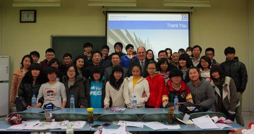 2012年2012年11月12日上午,澳大利亚伊迪斯科文大学副董事长金慕·克劳斯教授来到B-408教室看望WilliamHill中文官网入口中澳项目员工,并与同学们进行面对面交流。WilliamHill中文官网入口各位老师和伊迪斯科文大学驻京代表参加了会面。