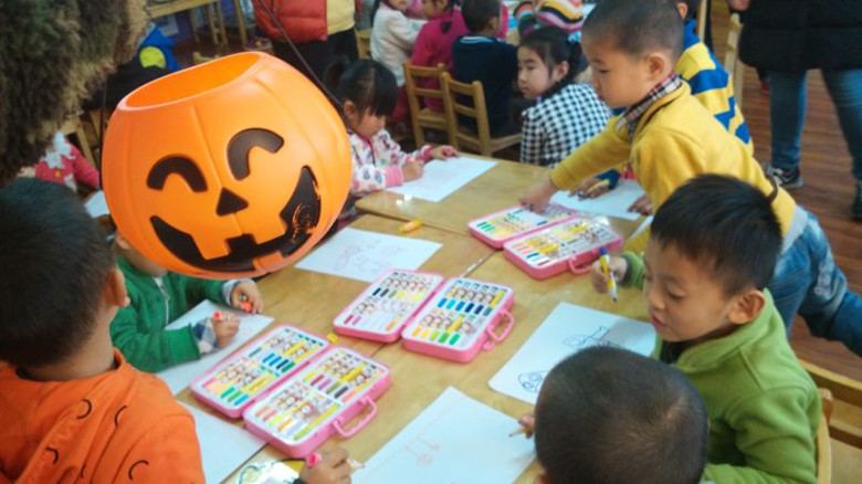 志愿者为孩子们精心准备了万圣节短片,以便孩子们可以更好地了解国外的一些节日。他们在教室里挂上象征着万圣节的南瓜,并且和孩子们一起画南瓜。在教授孩子们学习万圣节相关英语单词时,大家都非常专注,一起学习,一起快乐着……