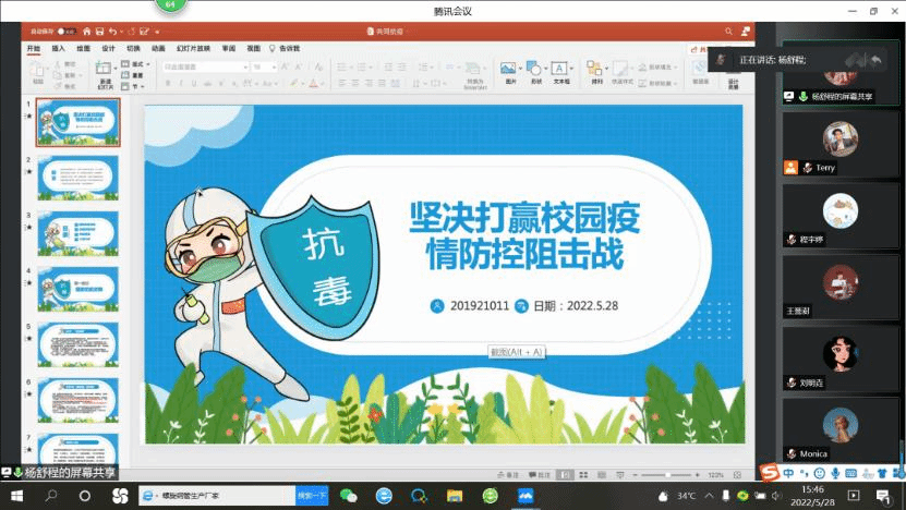 2022年5月23日起,在公司党委和上级团组织的领导下,WilliamHill中文官网入口团委有计划、分层次地组织各支部召开“团结一心,众志成城,坚决打赢校园疫情防控阻击战”主题团日活动,实现全覆盖,全员发言、表决心。一是认同国家防疫政策方针,坚定“四个自信”;二是认清全国和北京疫情形势;三是支持配合校园和社会防控措施,自觉做表率;四是发挥团员青年先锋队突击队作用,坚持打卡、做核酸、接种疫苗、不出校园、不外卖不网购。各团支部采用学习讨论、心得分享、经验共享、海报制作、短视频等多种方式进行开展。在线上会议中,同学们积极发言,展开讨论,深感团员责任之重大。